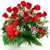 Cesta de rosas rojas con eucalipto natural y color rojo, paniculata y verdes variados.