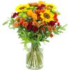 Ramo de flores frescas recién cortadas compuesto con rosas, girasoles, rosas de pitimini, margaritas y estatis.
