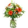 Ramo de flores frescas recién cortadas compuesto con rosas de pitimini, gerberas, lithiantus, margaritas paniculata y un surtido de verdes variados.
