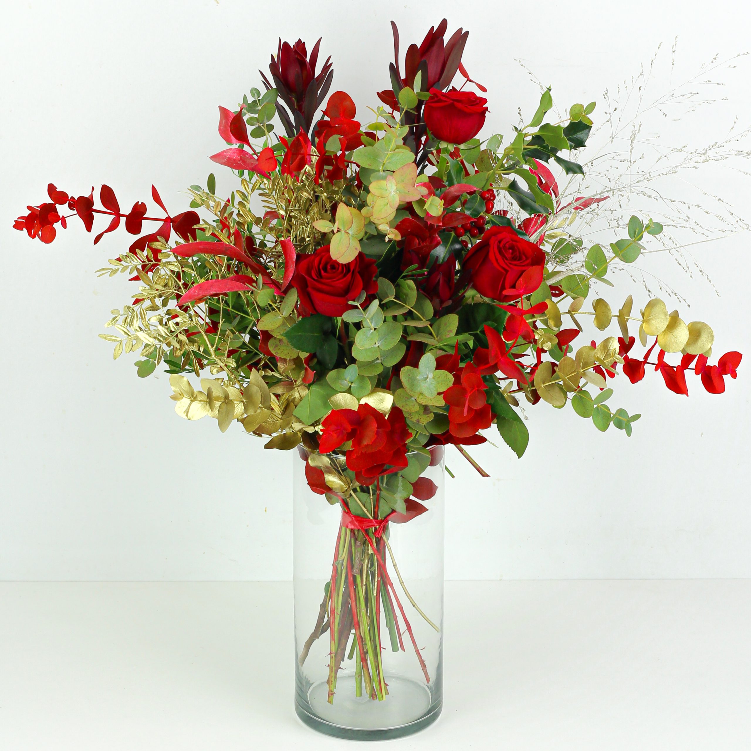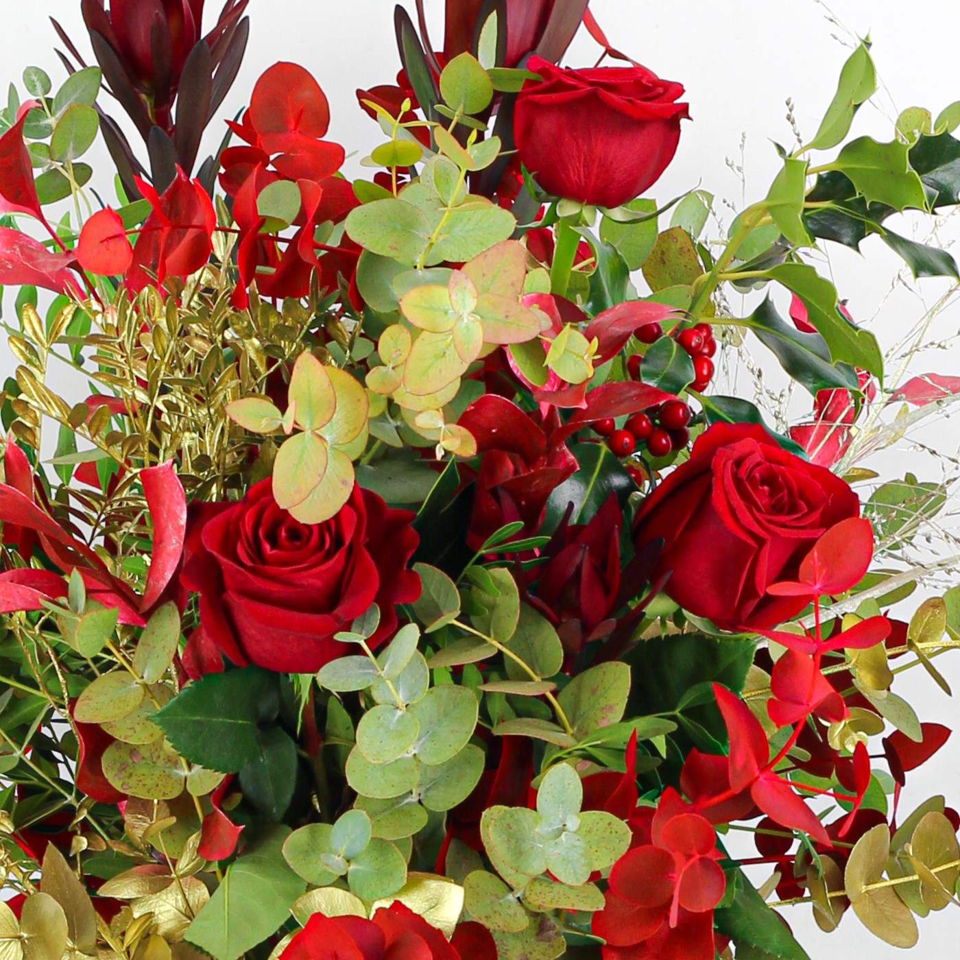Ramo de navidad con flores frescas compuesto con rosas rojas, eucalipto, eucalipto, lentisco, ruscus, leucodendron y un toque de acebo