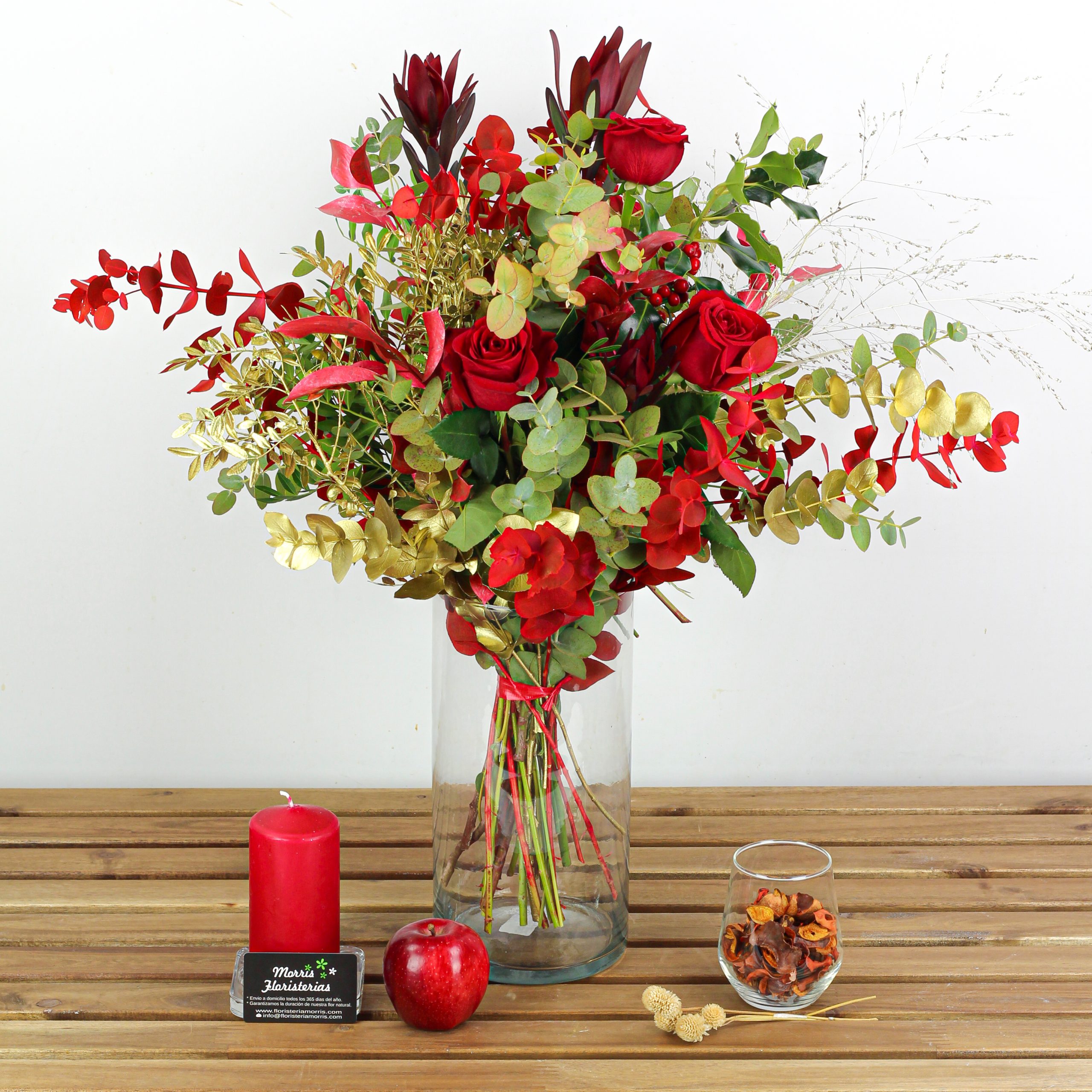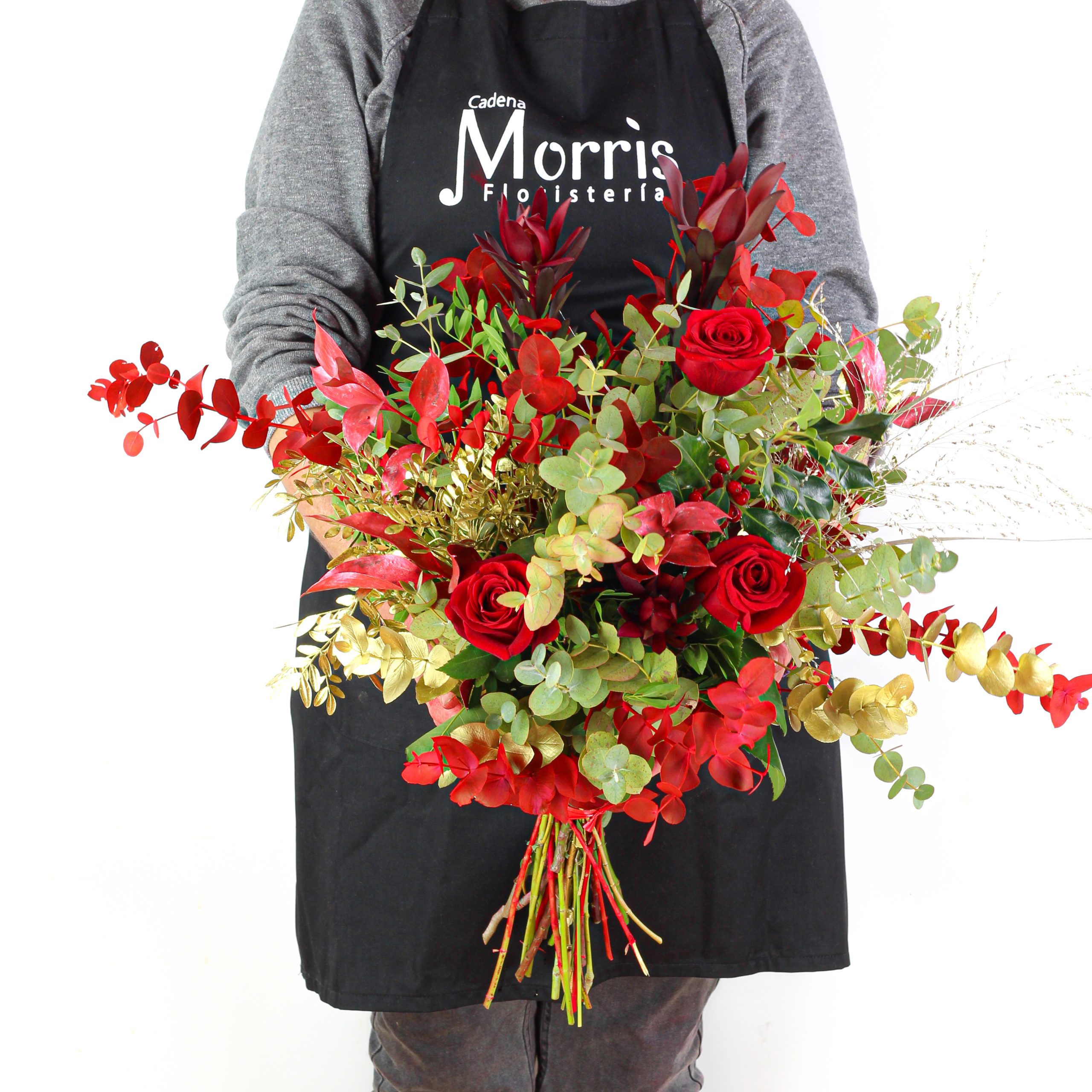 leucodendron, ruscus y un toque de acebo. Algunas de las flores de las imágenes son de temporada. Estos pueden variar ligeramente a los de la imagen dependiendo de su temporada y disponibilidad, siempre sustituyéndose por otras flores similares en estilo y valor.