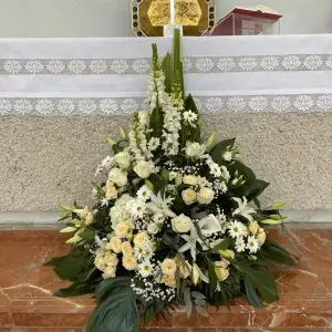 Uno de los puntos más importantes son las flores para altar de iglesia. El altar concentra gran parte de la atención durante la ceremonia, así que conviene trabajar bien esta zona con composiciones proporcionadas y elegantes. Las flores para altares de iglesias suelen incluir centros simétricos, peanas o estructuras laterales según el espacio disponible. En este punto encajan muy bien los blancos, los verdes y las variedades de flor con buena presencia, porque permiten crear una decoración floral de boda más armónica y solemne.