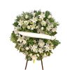 La corona blanca esta compuesta por un surtido de flores variadas sobre un aro, dándole un aspecto a las clásicas coronas americanas. Estas coronas pueden tener una altura aproximada de 180 cm. Las ilustraciones son sólo para orientación. Las flores pueden variar de aquellas que aparecen en la imagen. Nuestros floristas profesionales pueden substituir flores por una alternativa conveniente, similar en estilo, calidad y valor.