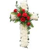 La cruz blanca y roja es un arreglo compuesto por claveles blancos con un centro de rosas rojas rematado con un surtido de verdes variados. Este arreglo puede tener unas dimensiones aproximadas de 50 a 70 cm de largo dependiendo del tamaño seleccionado.