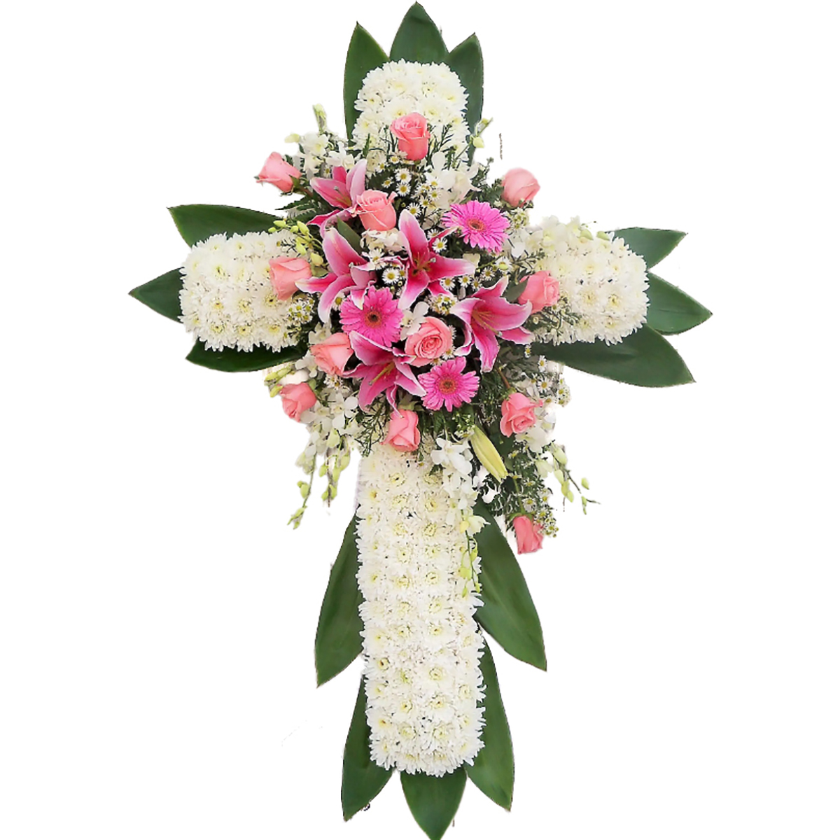 La cruz blanca y rosa es un arreglo compuesto por crisantemos blancos con un centro de flores variadas rosadas y blancas rematado con un surtido de verdes variados. Este arreglo puede tener unas dimensiones aproximadas de 60 a 80 cm de largo dependiendo del tamaño seleccionado.