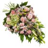 El ramo fúnebre rosado es un ramo compuesto por flores variadas con una armonía de colores rosados y verdes y un surtido de verdes variados. Las imágenes son orientativas, algunas flores pueden variar de aquellas que aparecen en las imágenes según su temporada y disponibilidad. Nuestros floristas profesionales pueden sustituirlos por otra alternativa similar en estilo, calidad y valor.